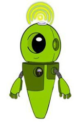 The mark consists of a green robot with a round head, two arms, and a tapered body. The body has a darker green square on the front and on each side where the arms attach. The head consists of a black circle inset for an eye and a smaller circle with a green inset on the side of the head with concentric partial circles radiating from the top of the robot's head in alternating yellow and green.