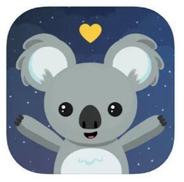 The mark consists of a blue square with rounded edges, inside of which appears the upper body of a smiling gray koala holding its arms out in front of the blue background with white dots, representing a night sky with stars. A yellow heart appears above the koala's head. The koala's eyes are black and white, its nose is dark gray and black, its claws are black, its mouth is black and with a red tongue and its ears and stomach feature round white details with blue wavy shading.