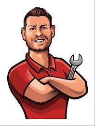 The mark consists of a caricature of a smiling person with brown hair and white teeth wearing a red short sleeve shirt, with crossed tan arms and holding a gray colored wrench in one hand. All outlined in black.