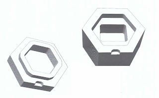The mark consists of The following primary features are claimed: (a) Hexagonal Wooden Box. The wooden box contains a Hollowed Semi spherical notch on one side. The box consists of a lid and a main body that can be separated at the distinctive semi spherical notch. (B) Hexagonal Lid. The hexagonal lid contains a portion of the semi spherical notch. The under portion of the lid contains an intricate and distinct three dimensional hexagonal pattern protruding from the middle portion of the lid. The protruding middle portion of the lid contains an inner recessed hexagonal surface. The features of the protruding middle hexagonal pattern on the lid comprises complimentary features that connect to the main body (c) Hexagonal Main Body. The main body has an outer Hexagonal shape with a portion of the distinctive semi spherical notch on one side that compliments the lid. The main body comprises a middle recessed hexagonal pattern. Within the middle recessed hexagonal pattern there is an inner recessed rectangular pattern. The inner recessed rectangular pattern comprising a flat surface for holding objects, such as rings.