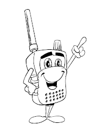 The mark consists of a handheld radio with an antenna, with a face including eyes, lashes, and an open, smiling mouth, and arms with a right hand on the right side of the radio as a representation of resting the hand on the hip, a left hand raised with a finger pointing upward.
