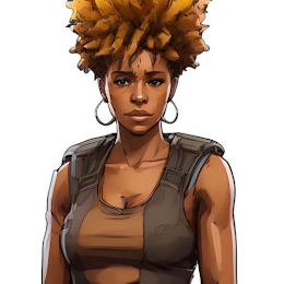 The mark consists of a woman with brown skin wearing grey hoop earrings and a brown tactical vest with exposed arms and orange-yellow hair extending up and away from her head. The woman's eyes are black and white. Her eyebrows are brown. There is black shading and outlining within the design. There are white highlights within the design. All other areas of white represent background area and are not a part of the mark.