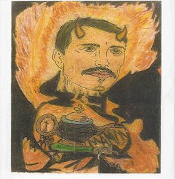 The mark consists of the head of a man having beige skin, brown hair and mustache, red lips, and gold and red horns with a red and orange fiery and black background with a lamp disposed below the man's head wherein the lamp has a brown body, blue rim, orange lid, and gold lid handle and wherein the lamp is disposed on a green platform.