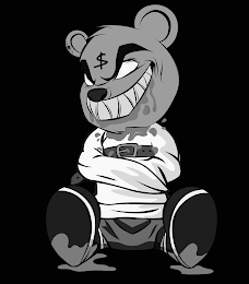 The mark consists of The mark is a teddy bear in the seated position, in which the bottom of its shoes are facing toward the photo. The bear's facial features include: two large eyebrows that curve the top of its large round-shaped eyes; a wide deranged smile with razor sharp triangular-shaped teeth showing a liquid dripping from the bottom of its mouth onto its face; a dollar currency sign placed in the middle of the forehead; a round nose in the center of the bear's face, right under the dollar sign but above the wide smile; two round shaped ears with a small circular hole in its right ear, with a liquid splatter around it. The bear is wearing a straight-jacket which straps its arms across the front of its chest, hiding its arms under the garment of the straight-jacket. The straight-jacket has a belt with a large buckle in the front of the bears chest, with four liquid splatters on the front of the belt, while the strap of the belt hangs off on the right side of the bear. Under the bear's chin, all along the bottom of the bears head, is liquid dripping all along the top of the straight- jacket and along the shoulders and arms are more liquid splatters. The bear is wearing shorts, shoes and socks. The sole of the shoes have the same liquid splatter that has appeared on the bear's face, ear, straight-jacket and belt, which has created a puddle under the bear's feet.