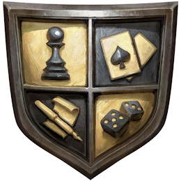 The mark consists of a tan shield, outlined in black, divided into four quadrants with black and tan alternating panels. A black chess pawn appears on a tan panel, a pair of tan playing cards with a black spade visible on one card appear on a black panel, black dice with tan dots appear on a tan panel, and a tan sheet of paper and tan pen appear on a black panel.