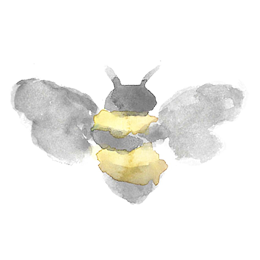The mark consists of watercolor bee in gray, black, and yellow.