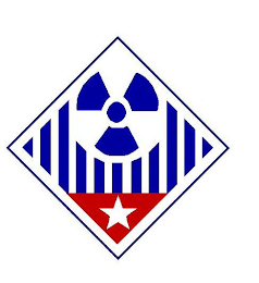 The mark consists of a slanted rectangle shape blue border with a white interior. On top of the white interior, in the top middle is the international radiation symbol in blue. To the left and to the right and below the international radiation symbol are vertical blue bands. The bands furthest to the left and furthest to the right resemble triangles. Below the vertical bands is an upside down red triangle with a white star on top of the red triangle.