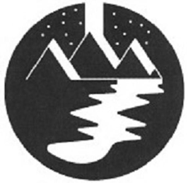The mark consists of a circle design with a vertical line at the top, white dots on each side of the vertical line resembling stars, three stylized mountains below the vertical line, and a white squiggly line at the base of the mountain on the right that resemble a stream or river.