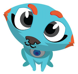 The mark consists of a cat-like creature with a blue body, a blue oval head with orange tips of each side of the head, and two orange eyebrows outlined in dark orange on the bottom. The creature has white eyeballs with dark blue outlining around the outside. Inside the white eyeballs are black pupils which are outlined in grey. Each eyeball has a white oval shadow-like design over each pupil and surrounding outlining. The eyeballs have black shadow-like borders underneath the bottom. The creature also has a grey nose outlined in black and a black mouth. The creature also has three concentric circles on its chest with grey outlining around the outside of the circle. The innermost circle is dark blue, the middle circle is light blue outlined in dark blue, and the outermost circle is white.