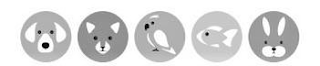 The mark consists of five shaded circles in a horizontal row with the first containing the face of a dog, the second containing the face of a cat, the third containing a bird, the fourth containing a fish, and the fifth containing the face of a rabbit.