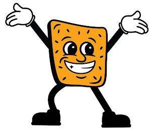 The mark consists of an anthropomorphic figure of a square-shaped orange cracker with black ovals and curved lines around its face outlined in black, with black and white eyes, a black nose, black eyebrows, with black arms, black legs, and a white smiling mouth outlined in black containing a black line representing the space between the top and bottom teeth and a black four-pointed star shape representing a sparkle, with the figure wearing black shoes and white gloves outlined in black and the figure putting both hands above its head. The color white appearing around the figure represents background and is not claimed as a feature of the mark.