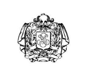 The mark consists of a design of a shield with a skull at the top with curved flourishes on both sides of the skull, on either side of the shield are curtains, within the shield and below the skull are crossed bones, under which is a smaller shield superimposed on which are curved intersecting lines, to the right and left of the inner shield are designs of grape vines around which are ribbons, below the inner shield is a design of featuring leaves with horizontal curved banners on either side going the length of the design.