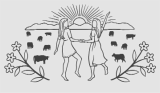 The mark consists of two female characters in in front of a setting sun on the horizon. The characters are holding hands and the one one the right is gesturing toward the horizon. The characters are surrounded by images of cows and 2 images of plants with leaves and three flowers each are on either side of the characters.