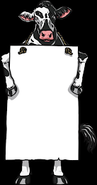The mark consists of a black and white cow holding a blank sandwich board. The nose and the inside of the cows ears are pink. The cow has a brown rope around its neck that goes through the top of the sandwich board. There is gray shading throughout the cow's body. The color black is also used to indicate background, outline, shading, and/or transparent areas. The black background is not part of the mark.