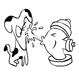 The mark consists of a cartoon stylized white dog with black spots that is being splashed in its face by water sprayed from the mouth of a cartoon stylized fire hydrant.