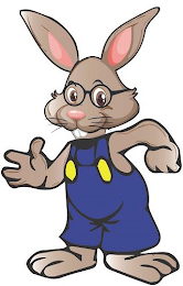 The mark consists of a light brown bunny rabbit wearing navy blue overalls with yellow button straps, black eyebrows, white, brown and dark brown eyes, black whiskers, white teeth, a light pink nose, light pink ears, and black glasses.