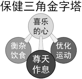 The non-Latin characters in the mark transliterate to "BAO JIAN SAN JIAO JIN ZI TA; XI LE DE XIN, YOU HUA YUN DONG; ZUN TIAN ZUO XI; HENG ZA YIN SHI" and this means "TRIANGULAR PYRAMID OF HEALTH AND FITNESS; JOYFUL HEART; OPTIMIZED EXERCISE; WORK AND REST THAT COMES NATURALLY; MEASURED AND VARIED DIET" in English.