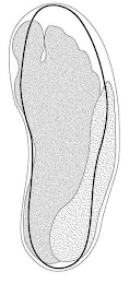 The mark consists of a representation of the outlines of two overlapping shoe soles and two overlapping footprints within the soles.