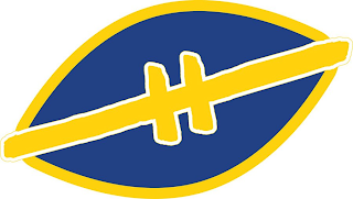 The mark consists of the stylized design of a blue football outlined by a thick yellow line. The football contains two vertical yellow laces intersected by a thick yellow line which extends past the ends of the football, all of which is outlined by a white line which is itself outlined by a thin yellow line. The remaining white in the mark represents background and/or transparent area and is not claimed as a feature of the mark.