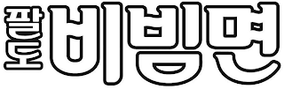 The non-Latin characters in the mark transliterate to "PALDO" and "BIBIM MYEON" and this means "EIGHT PROVINCES OF THE KOREAN KINGDOM JOSEON" and "MIXED NOODLES" in English.