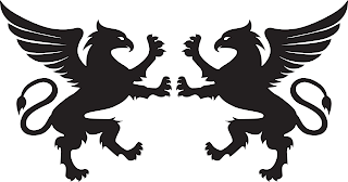 The mark consists of two griffins, winged fictional animals with eagle-like heads and beaks, lion-like bodies with four limbs ending in paws, wings, and lion-like tails curled up behind each griffin. The griffins are facing each other in a mirrored fashion.