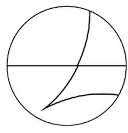 The mark consists of a circle divided horizontally in half also having a cone-shape beginning near the bottom left-hand of the inside of the circle extending upward to the right side of the circle.