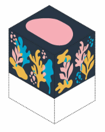 The mark consists of a three-dimensional configuration of a closable box container for the goods with the top of the sides containing pink, dark yellow, and light blue blob shapes over a dark blue background, forming an underwater scene with corals, seaweed, and bubbles, with the bottom of the sides filled with white rectangular areas. The mark also includes a pink oval-shaped area applied to the lid of the closable box container of the goods. The dotted lines outlining the closable box container are intended to show the position of the mark on the goods and are not part of the mark. The dotted lines outlining the product information panel are intended to show the position of the mark on the goods relative to the product information panel and are not part of the mark.