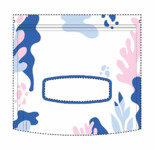 The mark consists of a three-dimensional configuration of a zippable bag container of the goods containing an underwater scene with corals, seaweed, and bubbles formed by light blue, dark blue, and light pink contiguous blob shapes applied to a white background surface of the container, and in the center of the design a dark blue oval-shaped ring. The dotted lines outlining the zippable bag container are intended to show the position of the mark on the goods and are not part of the mark. The dotted lines outlining the product information panel are intended to show the position of the mark on the goods relative to the product information panel and are not part of the mark.