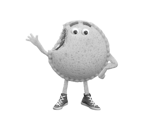 The mark consists of a round crustless sandwich representing a body, with a crescent shape representing a mouth, and with eyes, eyebrows, arms, legs and shoes.