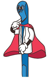 The mark consists of the design of a character represented by a laboratory spatula in blue outlined in black with a white jacket, white gloves, black and white eyes, black arms, mouth and eyebrows, and wearing a red cape, all the aforesaid being outlined in black.