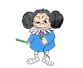 The mark consists of a cartoon of a young girl, in a blue dress with a white collar, wearing white stockings with black lines, holding a microphone in one hand and green drumsticks in the other hand, with black hair in two buns on either side of her head, and a mischievous look on her face.