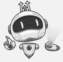 The mark consists of the shape of a stylized robot, having a rounded helmet with two ears on the sides, a broad crescent shaped visor in the front, and three arrows on the top, with the center arrow shorter than the other two. The robot has a stylized triangular body with two stub shoulders attached to the sides, with the eyes visible through the visor, with the hand on the left pointing up and the hand on the right open with a projector in the palm.