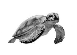The mark consists of a realistic looking sea turtle who is facing to the right and smiling.