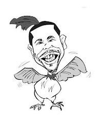 The mark consists of black and white outline of stylized chicken with human head and rooster comb on human head and scarf on chicken neck.