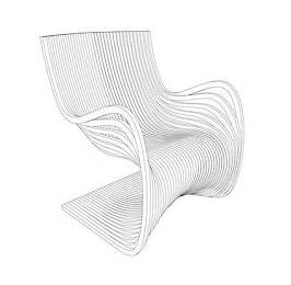 The mark consists of a three-dimensional configuration of a chair consisting of multiple curved structural members forming generally partial S shapes in side views and forming a generally rectangular base of the chair.