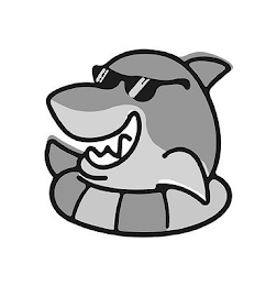 The mark consists of a shark smiling and wearing sunglasses, wearing an inflatable tube float.