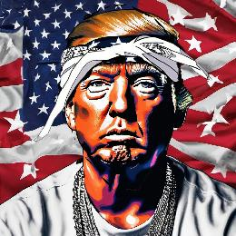 The mark consists of President Donald Trump in a potrait type image wearing a tee shirt, multiple necklaces and the iconic white and black tupac bandana. Trump is standing in front of a red, white and blue flag.