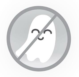 The mark consists of a stylized figure of a ghost with eyes and a smiling mouth contained within a circle and backslash with gradient background going darker to lighter from top to bottom.