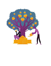 The mark consists of a tree in the background with a blue canopy, purple branches and a purple trunk with dark purple lines along the branches and trunk, and heart-shaped fruit that fades from light orange to dark orange from top to bottom with a light blue stem and light blue leaves at the tops of the fruit. Sitting at the base of the tree is a woman with a dark blue face and hands, light blue smile, light purple hair and eyes, a black shirt with blue horizontal stripes and light purple pants. The woman is eating a heart-shaped fruit that fades from light orange to dark orange from top to bottom and has a light blue stem. The woman is sitting on a building structure that is composed of vertical alternating light orange and dark orange pillars, a center portion having a v-shaped roof in light orange with a dark orange inner outline and dark orange triangle, and dark orange steps outlined in light orange. To the right of the building structure is a man who has a dark purple face, left arm, hands, and feet. The man has a light purple right arm, a light blue smile, black eyes, dark blue hair, a light purple shirt and black pants. The man is holding a watering can with a light orange spout and alternating dark orange and light orange stripes across the rest of the can. Yellow water drops are coming out of the can's spout onto the building structure. The white behind the mark represents background and is not a feature of the mark.