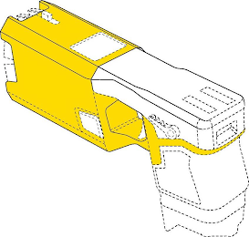 The mark consists of the three-dimensional configuration of a conducted energy weapon (CEW) with a convex deployment end tapering towards the trigger as viewed from both the side and the top, with a polygonal trigger opening that narrows towards the grip, and with yellow applied to the housing at the deployment end, around the trigger opening, and extending rearward across the grip. The dotted lines indicate features that are not claimed as part of the mark and serve only to show the position of the mark on the goods. The white in the mark is background only and is not claimed as a feature of the mark.