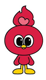 The mark consists of an illustration of an animated bird with a red head, red body, red arms and red hair and a pink lopsided heart in the red hair. The bird has a yellow beak and yellow legs and feet. The bird's eyes are white ovals, with black ovals inside the white ovals and white dots within the black ovals.