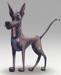 The mark consists of the figure of a dark brown dog with black eyes, eyebrows, nose, mouth and whiskers, a small patch of white hair on his head, pink ears and an elongated tongue and a beige underbelly, with bite marks appearing on the right ear, all amongst a rectangular colored background that fades from medium brown at the top to white at the bottom.