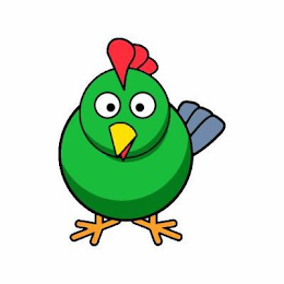 The mark consists of a stylized cartoon rooster, outlined in black, with a green body, red comb, yellow beak (with an inner red portion), and blue tail feathers, and wide-open white eyes with black irises.