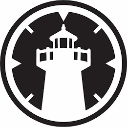 The mark consists of a stylized rendering of a lighthouse in white, against a black circular background that is indented in its circumference with seven compass points at 45 degree intervals. The black circular background is itself centered on a white background enclosed by a black circle.