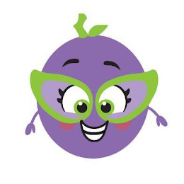 The mark consists of the color purple in the grape. The color green appears in the grape's stem, eyes and glasses. The color black appears in the grape's eyebrows, pupils, lips and eyes. The color white appears on the grape's teeth and eyes. The color lavender appears in shading of the glasses. The color pink appears on the grape's cheeks.