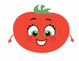 The mark consists of the color red in the tomato's skin. The color green appears in the tomato's stem and eyes. The color black appears in the tomato's eyebrows and eyes. The color maroon outlines the mouth and appears on the tomato's cheeks. The color white appears in the tomato's eyes and mouth.