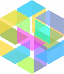 The mark consists of a multi-colored gemstone design formed by interlocking blocks of light magenta (HEX ff45f7), dark yellow [olive tone] (HEX 7ba200), light green (HEX b8ff5c), light blue (HEX 6f45ff), dark yellow [olive tone] (HEX 7ba200), light yellow (HEX ffdd45), light cyan (HEX 45d2ff), light blue (HEX 45b8ff), light blue (HEX 5c98ff), vivid green (HEX 74ff2e), pure (or mostly pure) cyan (HEX 00ffd7), and vivid orange (HEX ff9317).
