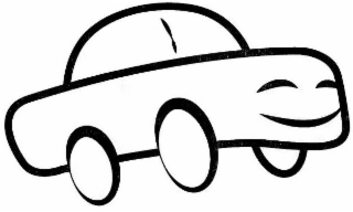 The mark consists of an automobile outlined in solid line that is facing to the right with three wheels outlined in solid line, and with an arc in solid line representing a smiling mouth and two arcs in solid lines representing two closed eyes on a right side of the automobile.