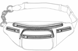 The mark consists of a three-dimensional configuration of a crescent-shaped leather bag with three horizontal zipper enclosures of varying lengths on the upper and outward-facing surfaces of the main compartment, and one zipper over the upper portion of a protruding rectangular compartment at the center of the bag, with a second horizontal zipper on the face of the same rectangular compartment, and a flat adjustable belt, with a clasp extending from the narrow right end of the bag around to a large metal circular ring, which attaches to a smaller oval-link chain that connects to the left narrow end of the bag. The broken lines depicting the crescent-shaped bag, the rectangular compartment, and the flat adjustable belt are intended to show the shape of the goods and are not claimed as a feature of the mark, while the solid lines around the zippers are intended to aid in depicting the placement of that portion of the mark, and the solid lines that comprise the large metal circular ring and smaller oval-link chain depict that portion of the mark.