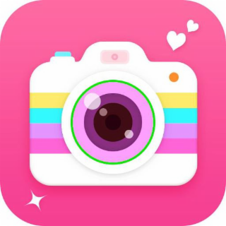 The mark consists of a square with rounded corners containing a stylized image of a white camera with horizontal stripes on a pink background, with two small white hearts in the upper right, and a small white star in the lower left. The camera's stripes are yellow, blue, purple, and pink. The camera's lens is black, brown, purple, pink, green and white with three grey dots, slightly transparent, in the middle of the lens, and there is a small orange circle in the upper right of the camera representing a flash. Above the middle of the camera is a light pink small rounded rectangle with a dark pink small circular hole inside, representing the camera's viewfinder. In the upper left corner of the camera is a blue rounded rectangle, representing a button to operate the camera.